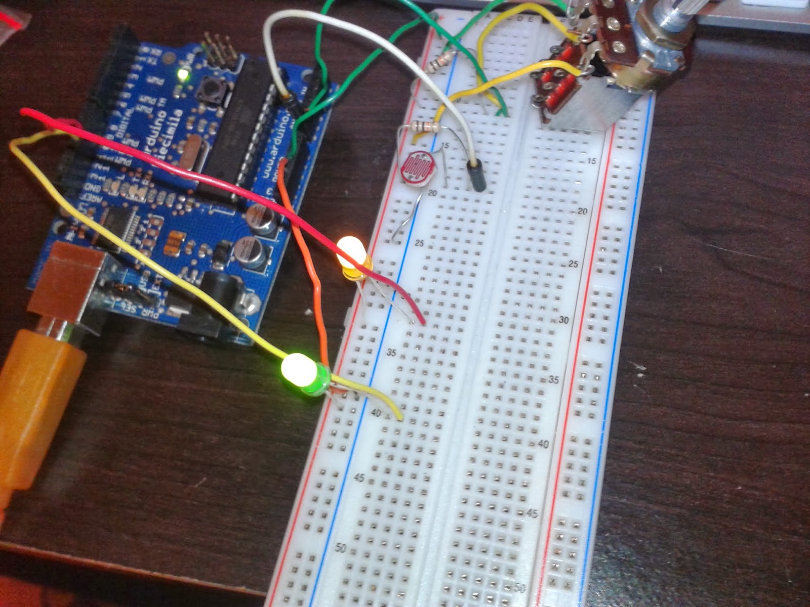The leds would blink back and forth. However when I obstructed the photoresistor or turned the potentiometer knob, the green led would react by blinking more frequently. I was unsure how to make the other led blink more on it's own. I believed that because I was using a 10k ohm potentiometer instead of a 100k ohm as specified in the fritzing diagram resulted in the more frequent blinking of the green led. Things are feeling a bit hazy for me. Not exactly sure what the result should be. I understand that the diagram is highlighting three different types of voltage divider, but I am unclear as to what the final result should look like.